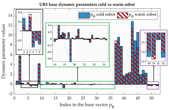 Since both robots have been mounted on the ground, their dynamic behavior is fully described by 52 base dynamic parameters. In Figure 3a,b are reported, respectively, the numerical values associated with the elements and of the vectors reported in Equations (A1) and (A2).