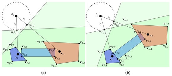 and the set whose elements are the relative positions of the load vertices with respect to the follower position given an arbitrary fixed configuration, e.g., corresponding to the case . Given the actual position of leader and follower, to ensure the obstacle avoidance by the transported load, we have to consider the position of each i-th vertex of the load, . In the light of the given premises, it holds that