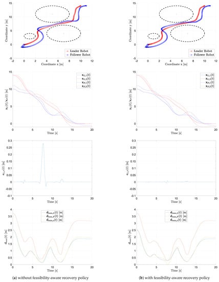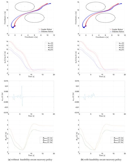 Figure 2 reports the outcome of one of the performed numerical simulation, providing both an overview of the scenario and of the task evolution and the behavior of the performance metrics. The two columns refer respectively to the case in which the recovery policy of Section 5 is considered (right) or not (left). For both cases, we report the planar trajectory of the leader and follower (first panel, at the top) as well as the trend of their position components (second panel), the trend of the formation error (third panel) and the trend of the index for (fourth panel).