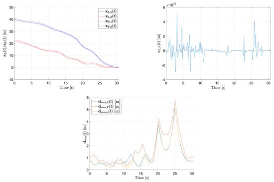 The reported plots allow us to assess the performance of the proposed MPC-based trajectory generation strategy and, in particular, to appreciate the benefit deriving from the introduction of the feasibility-aware recovery policy. Indeed, it is possible to observe that, both with and without implementing the recovery policy, the leader converges towards the target position (second panel in Figure 2). However, the employment of the recovery policy is motivated by the rapid increase of the leader–follower formation error at approximately s, in correspondence to the narrow passage by the two obstacles: the modification of the MPC optimization function for the leader is effective in leading to a smaller formation error (third panel) at the cost of a slightly slower convergence speed. Finally, the plots in the bottom panel confirm that the agents and the load are able in both cases to keep the desired distance from the obstacles. As a further remark, we notice that the challenging region to overcome is the one closest to the obstacles, where the obstacle avoidance constraints are modified more quickly.