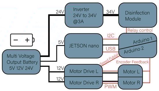 Figure 2 illustrates the connection diagram of the power supply and control hardware of the robot system. In addition to carry the disinfection module, the autonomous moving platform also contains several supporting components, including control boards, lidar, and a battery capable of supplying multiple voltages (e.g., 5, 12, and 24 V) for providing a suitable power supply for the disinfection module. The ultrasonic atomizer disinfection module is used to atomize the hydrogen peroxide disinfectant at a rate of 1500 mL/h in the indoor environment.