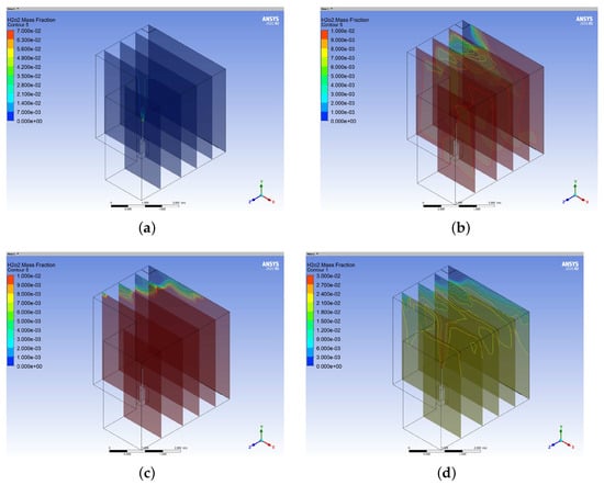 For better illustration, five planes were inserted into the disinfection space evenly, displaying the contours of the H2O2 mass fraction of the plane surfaces. The image was saved once per 5 timesteps, with one timestep set as 1 s. After delivering DHP for 120 s, the simulation results of contour plots are shown in Figure 4a. After delivery for 850 and 1200 s, the mass fraction contours are as shown in Figure 4b,c, respectively. It is seen that as the delivery time continues, the DHP keeps spread through space. At around 850 s, the surfaces of the disinfection space reach the concentration of 1%, which satisfies the requirement of surface disinfection. It takes another 350 s for DHP to diffuse across space, except for the space near the passive air inlet. The total simulation time was set as 3000 s. This was still not enough for the entire concentration of the DHP to reach 3%, which is required by the NHC of China for air disinfection. The highest spread of DHP is concentrated near the inlet in the space. A longer disinfection time or higher concentration of H2O2 disinfectant are expected to achieve effective disinfection.