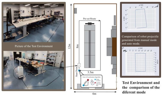 The core of the control system is the upper-level controller (or master controller). In this work, the embedded control board (model: JETSON Nano, from Nvidia Corp., Santa Clara, CA, USA) was adopted and programmed on the basis of Robot Operating System (ROS) to handle all of the input and output channels. Typical input includes the data of surrounding distance from the lidar (model: RPlidar A2, from Shanghai Slamtec Co., Ltd., Shanghai, China), which are acquired to detect obstacles in the nearby environment for avoiding possible collisions. In combination with the odometry data from the encoder of the driving wheels (the resolution of wheel encoders is 2550 (17*150), the basic pulse is 17 ppr, and the gear ratio is 1:150), it facilitates map establishment of the designated area for use in navigation.