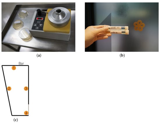 For the air quality test, bioaerosol sampling with a single-stage cascade impactor (from SKC BioStage, Inc., Eighty Four, PA, USA) was used, as shown in Figure 9a. During the process, all of the procedures meet NIOSH Method 0800 indoor bioaerosol sampling requirements. For the contact surface test, the sterile surface swab kit (from SKC BioStage, Inc.) was adopted, as shown in Figure 9b. The combination of these two methods gives an accurate evaluation of the disinfection effect.