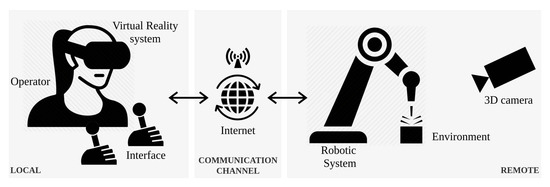 Since the invention of the first telemanipulator system in the 1940s [1], teleoperation has played an important role in the nuclear industry for tasks such as handling, maintenance and decommissioning [2,3]. Teleoperation enables a user to manipulate objects remotely, and an increased level of immersion (i.e., as if the operator is located at the remote site) can increase the safety and reliability of the operations. A typical teleoperation system has the means (e.g., an interface between the operator and the manipulated in situ objects such as a joystick or haptic pen) to allow the operator to provide motion commands to the robotic system performing the actual task in situ, as shown in Figure 1. This interface may be a replica of the device that is deployed in the remote environment [4]. Such interface devices can be controlled in a unilateral or bilateral fashion. On the one hand, unilateral control refers to a situation where one side follows the position or forces of the other. On the other hand, bilateral control is a scheme where both the interface and robotic systems feed-back to each other in a closed-loop architecture.
