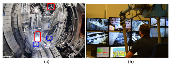 JET’s remote handling system: (a) MASCOT manipulator (robotic system) inside the JET vacuum vessel; and (b) operator, interface and viewing system. Red and blue squares represent the HD and ancillary cameras, respectively, mounted on MASCOT.