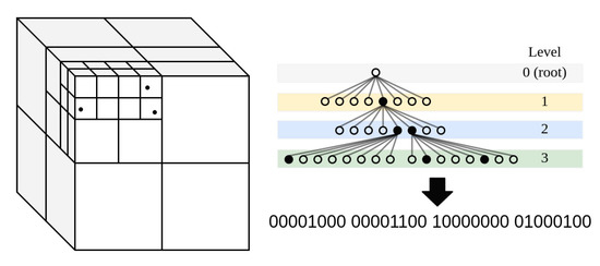 G-PCC encodes geometrical information associated with the location of each point in the 3D space using data structures, such as octrees (discussed in more detail in Section 3.1), kd-trees and binary trees. Investigations presented in [24] showed that G-PCC is more suitable for sparse point clouds in comparison with V-PCC, which applies to most real-time data acquisition applications. At the time of this writing, both V-PCC and G-PCC standards are still under development [29,30].