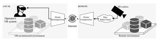 First, the raw point cloud data are obtained using a 3D sensor at the remote location. It is worth noticing that no data pre-processing is considered in order to prevent any extra delays in the processing pipeline. However, if ultra-high-resolution cameras are used (e.g., >2 M points) pre-processing is recommended. Most of the currently available 3D cameras provide on-board pre-processing capabilities such as down-sampling, attenuation, cropping and outlier removal. Some devices even provide an intermediate layer between the camera and the output using field-programmable gate arrays (FPGAs) for high frame rate pre-processing stages; an example of this can be found in the SceneScan Stereo Vision Sensor System by Nerian.