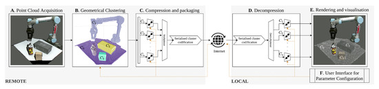 The general overview of the multiple level-of-detail point cloud compression is shown in Figure 6. The pipeline consists of five main blocks: A. point cloud acquisition; B. geometrical clustering; C. compression and packaging; D. decompression; and E. rendering and visualisation. An extra block, labelled as F., is also shown and represents the parameter configuration interface.