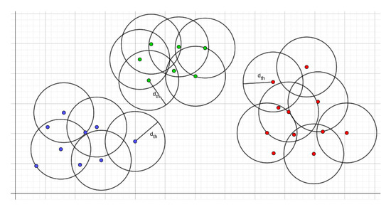 Once the ground has been identified, we proceed to perform the Euclidean cluster segmentation. In simple terms, the algorithm consists of analysing each point and find its nearest neighbours, this is, all the points located at a distance defined by a minimum distance threshold as shown in Figure 7. If a point lies within the neighbourhood of another point, this is flagged as processed and skipped in subsequent iterations. This is performed until all points are processed and grouped within a specific cluster. Other parameters such as the minimum and maximum cluster size, and minimum cluster-to-cluster distance can be specified by the user during runtime.