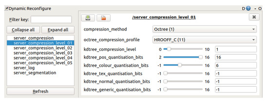 The output of the geometrical clustering is a set of clusters corresponding to different objects located on the scene where, by default, cluster correspond to the largest plane, typically the ground or surface where the objects are located. The individual clusters are then individually compressed at a level of detail defined by the user via the user interface for the parameter configuration shown in block F in Figure 6. This interface is displayed on the operator side and is communicates in real time with all the other blocks, allowing the adjustment of parameters during runtime based on the user needs. The actual graphical user interface (GUI) is shown in Figure 8.