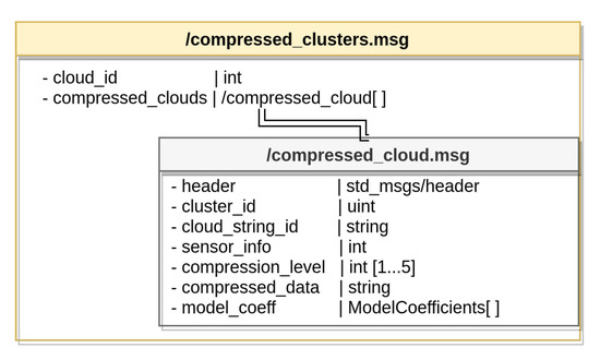 For the transmission of the compressed information, a customised ROS message was created. The structure of this message is shown in Figure 9. As can be observed, the custom message consists of a unique identified cloud (frame) as well as a vector of individually compressed clusters. Each of these clusters is provided with its own header, cluster ID, compression level, encoded data, and if existing, coefficients of an identified primitive geometrical model.