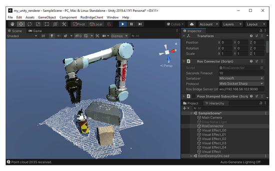 The native programming language of Unity is C#, hence we used ROS#, which is a set of open source libraries for interfacing the standard ROS middle-ware structure with .NET applications, such as Unity [43]. For rendering, we used the VFX particle renderer plug-in for Unity, which allows rendering millions of points as particles on-screen at the same time, as shown in Figure 10.
