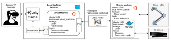 For reference, the system schematic diagram is presented in Figure 11. The remote desktop machine is equipped with an Intel Core i5-9600@3.7 GHz with 16 GB of memory. We relied on containerisation using Docker in order to prevent the vision system interfering with any of the libraries and drivers related to the robot operation. Moreover, the operative system (OS) requirements for vision and teleoperation are different. The robotic system works with ROS Kinetic under Ubuntu 16.04 whereas the vision system was developed under ROS Melodic under Ubuntu 18.04. Containers proved to be an excellent tool for isolating systems within the same machine while preserving the advantages of native processing hardware such as the central and graphical processing units (CPU and GPU) and random access memory (RAM). Our docker container was built using as base the image nvidia/opencl:runtime-ubuntu18.04 from https://hub.docker.com/r/nvidia/opencl (accessed on 12 July 2021). Within our container, the vision package is deployed and the clustering and compression nodes integrated, as described in Section 4.2 and Section 4.3. In terms of network, we used a virtual private network hosted on an Amazon Web Services (AWS) server using a Layer 2 Tunneling Protocol. This allowed us to establish secure communication as well as transmit and receive data as if connected to the same private network.