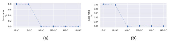 For comparison purposes, all the compression profiles shown in Table 1 were considered. As expected, the profiles that discard colour during compression, which are LR-NC, MR-NC and HR-NC, deliver the highest compression ratio, resulting in smaller codified point clouds with regard to its coloured counterparts. Particularly, the LR-C and LR-NC profiles offer the fastest computation and transmission times. For the LR-NC, it is possible to achieve frame rates of up to ∼17.44 fps (see Table 3). However, the loss-ratio rounds to ∼0.8, as shown in Figure 14a). Regardless of the compression profile used, the performance of raw 3D data transmission is surpassed by being able to provide update rates ranging from 3.25 fps, in highest coloured resolution to 17.44 colourless lowest resolution.