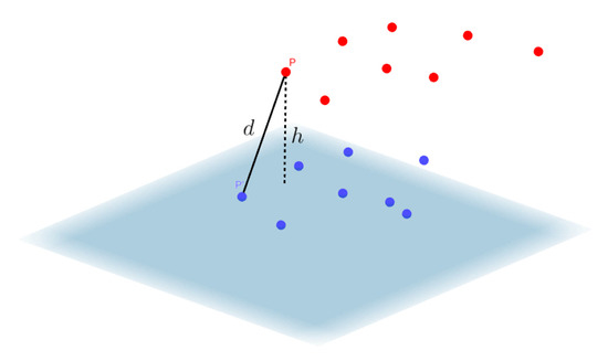 In order to provide an estimation of the distortion or differences of the decompressed point cloud with respect to the original point cloud, a point-to-model (P2M) comparison analysis was conducted [46]. For clarity, let us define the original (raw) point cloud as the reference and the decompressed point cloud as the target, these are represented with blue and red dots in Figure 15, respectively. For each point P in the target cloud, the closest point on the reference cloud is computed. Then, a local plane model is estimated utilising the neighbouring points to . With this information, it is then possible to estimate h. In this way, the mean of all h’s and its standard deviation can provide an intuitive estimation of the overall distortion after compression.