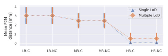 Figure 16 shows the mean P2M distance and standard deviation for each compression profile using single and multiple LoD compression. As can be observed, the mean remains fairly similar in both approaches. The main difference occurs on the high-resolution profiles were the single LoD approach exhibits less distortion.