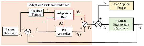 Consider Figure 1 which describes the control schematics of the Adaptive Assistance Controller (AAC). In this block diagram, the user applied torque () indicates the contribution of the human to the gait/motion. AAC assists the human-exoskeleton system to perform the desired task and the AAC controller command () contains four main blocks: reference trajectory (), required torque (), PD controller (), and the adaptation rule block which optimizes the exoskeleton assistive torque () and updates the PD controller gains. Note that in our mathematics are matrix, vector, and scalar, respectively.