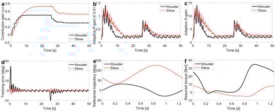 Figure 3 illustrates the simulation results for Scenario 1. It can be observed that for s, the exoskeleton contribution gains for both joints converged to their optimal values in 15 s, i.e., at shoulder joint and at the elbow joint. For s, the change in human applied torque re-triggered the adaptation, which converges to its corresponding optimal contribution gains in 5 s; for shoulder joint and for the elbow joint. Figure 3b,c shows the adaptive PD controller gains demonstrating an increase in PD gains at the start of simulation and at s to ensure the stability of control loop. Comparing Figure 3a–c shows that once the adaptation is converged, the PD gains are lessened to their minimum values. Tracking error is depicted in Figure 3d manifesting the stability of the closed-loop human-exoskeleton system thanks to the concurrent adaptation of feedforward contribution gain () and the PD controller gains; joint tracking error (mean ± s.t.d.) and error reduction for shoulder and elbow joints are reported in Table 1. After the adaptation settles to the optimal contribution gains, the tracking error magnitude remains below 2°; minimization of tracking error is our main adaptation objective. Finally, the desired trajectory and the required torque profile for each joint are reported in Figure 3e,f.
