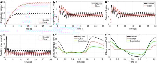 Scenario 2 simulation results are presented in Figure 4. Despite violation of the convergence assumption in this scenario, the adaptation rule successfully adapts the exoskeleton contribution gains to their optimal values in 15 s (see the converging gains in Figure 4a). Similar to Scenario 1, while the adaptation rule optimizes the exoskeleton contribution gain, the PD controller gains are increased to maintain the stability of the closed-loop system (see Figure 4b,c). Interestingly, in this challenging scenario, the human-exoskeleton system can guarantee a minimum level of tracking error while the adaptive PD controller gains are diminished to their minimum values (see Figure 4d where tracking error is lower than 5°). Joint tracking error (mean ± s.t.d.) and error reduction for shoulder and elbow joints are reported in Table 1. Finally, the torque profiles for both shoulder and elbow joints are reported in Figure 4e,f, respectively. In these figures, the exoskeleton torque supplements the human torque such that their summation is approximately equal to the required torque, i.e., it proves that the contribution gain is converged to an optimal value.