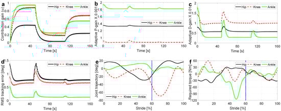 In order to investigate the adaptation performance of AAC in the face of variations in user applied torque, for each joint, the user contribution gain () is changed twice during the normal walking task; the variation times are s and s. The human contribution gains () are selected based on [] to simulate an individual with motor capacity reduction with some similarities to an incomplete Spinal Cord Injury (i-SCI); the more distal the joint, the less torque the person can apply with less contribution gain. For each time interval and joint, the human contribution gains () and the resultant exoskeleton optimal contribution gains () are reported in Table 3.