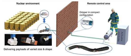 - Oshiro, T.; Palmer, C.; Hollinger, G.; Menguc, Y.; Palmer, T.; Courier, T.; Yirmibesoglu, O.D.; Morrell, S.; Rynes, A. Soft Robotics in Radiation Environments for Safeguard Applications. Available online: http://research.engr.oregonstate.edu/rdml/sites/research.engr.oregonstate.edu.rdml/files/soft_robotics_inmm_annual_2017.pdf (accessed on 28 September 2021).