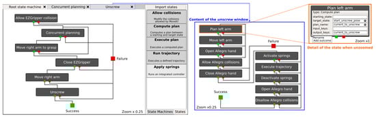 - Brunner, S.G.; Steinmetz, F.; Belder, R.; Dömel, A. RAFCON: A graphical tool for engineering complex, robotic tasks. In Proceedings of the 2016 IEEE/RSJ International Conference on Intelligent Robots and Systems (IROS), Daejeon, Korea, 9–14 October 2016; pp. 3283–3290. [Google Scholar]