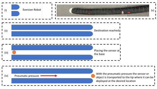 - (For unknown environments or destinations) The eversion robot has a longitudinal hollow, so once it has extended and reached its target, the sensor can be passed from one end of the robot (base) to the other end of the robot (tip)—as shown in Figure 8.