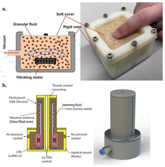 - Brown, J.P.; Farkhatdinov, I. Soft Haptic Interface based on Vibration and Particle Jamming. In Proceedings of the 2020 IEEE Haptics Symposium (HAPTICS), Crystal City, VA, USA, 28–31 March 2020; IEEE: Washington DC, USA, 2020; pp. 1–6. [Google Scholar] [CrossRef]