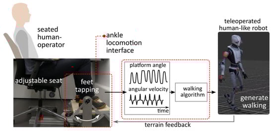 - Otaran, A.; Farkhatdinov, I. Walking-in-Place Foot Interface for Locomotion Control and Telepresence of Humanoid Robotso. In Proceedings of the 2021 IEEE-RAS International Conference on Humanoid Robots, Munich, Germany, 20–21 July 2021. [Google Scholar]