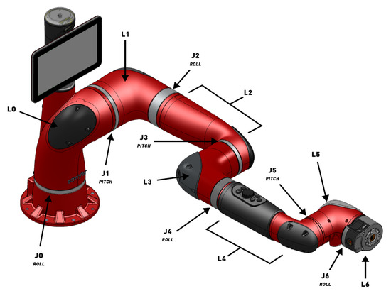 The robotic arm used in the simulation and experiments is Rethink Robotics’ 7-revolute (7R) Sawyer robot, which is shown in Figure 1, where the robotic arm is at its home configuration with all joint positions at zero . Home configuration and all of the dimensions were taken from universal robot description format (URDF) file dedicated to the Sawyer robot [26], and simple geometry reconstructed in Matlab is shown in Figure 2. Sawyer has 7 links and 7 revolute joints, 4 of which are rolling and 3 are pitching joints.