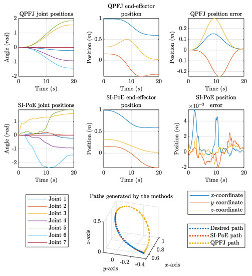 The experimental results for the joint positions and end-effector position are shown in Figure 13. The Sawyer robotic arm successfully tracked both SI-PoE and QPFJ trajectories with minimum noise introduced, which is evident in Figure 13, where the maximum position error of SI-PoE in any axis at any point of time within the trajectory is approximately 6 mm which correlates well with the simulated trajectory shown in Figure 11. The integrated error in all axes is 0.1172 ms, which is larger than the simulated integrated error of 0.0440 ms, which is attributed to the noise in the robotic arm throughout the entirety of the trajectory.