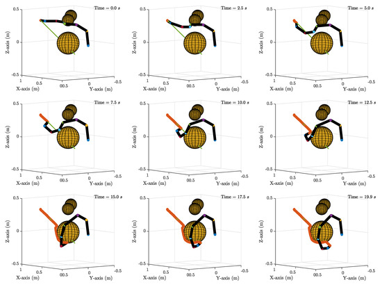 Furthermore, a constant screw axis (CSA) trajectory was implemented [27], with two obstacles in the way of the end-effector path. The desired path is demonstrated as a green line in Figure 16. The end-effector approaches the first obstacle at about 8 s, and in order to avoid the collision, the robotic arm moves in a clockwise direction along the collision boundary. At 10 s, the end-effector is once again on the desired path. However, at 12.5 s, the second obstacle blocks the path. This time the robotic manipulator avoids the collision by circumventing the spherical collision sphere from the top. At 15 s, the robotic arm successfully avoids the collision and continues the movement and tracking of the desired path while still avoiding collision between its links and the collision volume.
