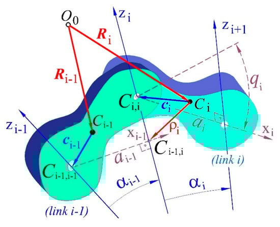 For convenience, select point and point as the intersection point of axes and Without loss of generality, assume coincides with the origin of the base coordinate system. Let the distance between two adjacent coordinate systems be represented by vector along . Denote by and the angular displacement between axes and and the vector . measured along axis . The generalized coordinates represent the relative translation or relative rotation along in case joint is translational or rotational joint correspondingly. For convenience, the motion of the robot arm links with respect to is considered in the following sections in terms of coordinate systems obtained by translating in the mass centers by vector (Figure 1). Then, the absolute linear position of link is given by the respective vector . Further on, the locations of the contact points , in are used to represent important constructs in the proposed dynamics model.