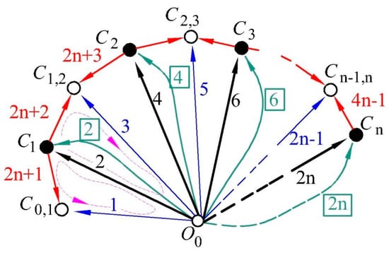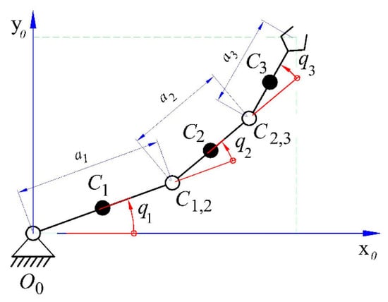 The first step in applying the here proposed model is to create the topological structure of the robot arm. The kinematic scheme in Figure 6 provides all the data needed to build the topological structure of the robot arm as well as the graphs and associated with this structure. The reference graph shown in Figure 7 displays the mass centers and the contact points , where each one of them is connected with branches to the origin of the base coordinate system Next, the chords (denoted in red), representing the reaction forces applied to the contact points in the joints, are introduced. Finally, the resultant of the external forces (denoted in green), applied in the mass centers, are added to the reference graph. Further on, graphs and are obtained from this reference graph by associating the corresponding through and across variables with its edges. For example, the pair of through and across variables attached to chord 7 is obtained as follows. The reaction force between the first link and the base is the through variable, while the across variable of this pair is the local radius vector of with respect to (Figure 1). Accordingly, the pair of through and across variables attached to chord 2, marked in green and used to denote the resultant force applied to the mass center , has the following interpretation. The through variable is the resultant of the external forces applied to , where, for simplicity, it is rendered only to the gravity force in this case study. The radius vector of with respect to the origin (Figure 1) represents the across variable of this pair of variables.