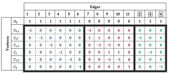 The next step in the modeling process is to represent the graph in Figure 7 in terms of a table expressing the relationships between vertexes and edges. These relationships between the vertexes and the edges of the reference graph and, respectively, of graphs and are described in Figure 8 as follows. The number of rows is equal to the number of vertices and the number of columns is equal to the number of edges, where the edge number is displayed with the respective color shown in Figure 7. The elements of this table indicate whether an edge enters a vertex, leaves a vertex or the edge is not connected to a vertex using values −1, 1 and 0, correspondingly. For instance, the edge with number 2 in Figure 7 is directed from to . Hence, the first element in row 1 and column 2 of Figure 8 is 1 (because edge 2 leaves from ) and the element in row 3 and column 2 is −1 (because edge 2 enters ). Thus, Figure 8 allows restoring the reference graph as well as graphs and .