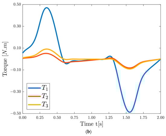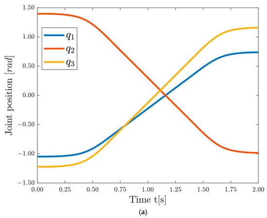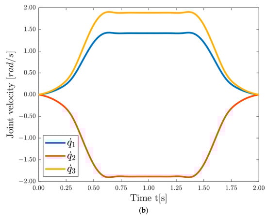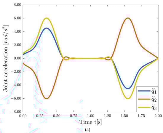 The computer experiments are conducted with MATLAB [] and consider a scenario, where the gripper moves from point A (233, −172, 0) to point B (269, 155, 0) in the workspace. The equations of motion are used to compute the torques necessary to apply in the actuators in order to execute the work task. The desired movement from point A to point B is performed for 2 s by executing commands for applying the computed torques to the actuators in the joints. A trapezoidal motion profile for the variation of the velocities is employed to achieve smooth movement in the joints must smoothly increase. The desired maximal velocities and accelerations for the generalized coordinates are computed with respect to their physical hard constraints as follows: and , and . The displacement in the generalized coordinates, their velocities, accelerations and the torques required to perform the movement are visualized in Figure 9 and Figure 10. The torques , and reach their maximum values at time [s]. They are , and , respectively. When