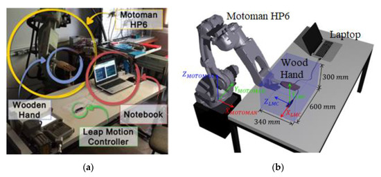 The leap motion controller was fixed to a table in front of the robotic arm so that the wooden hand attached to the robot could move in different positions within the sensor’s workspace. The disposition of the devices in the tests, as well as the wooden hand model used are shown in