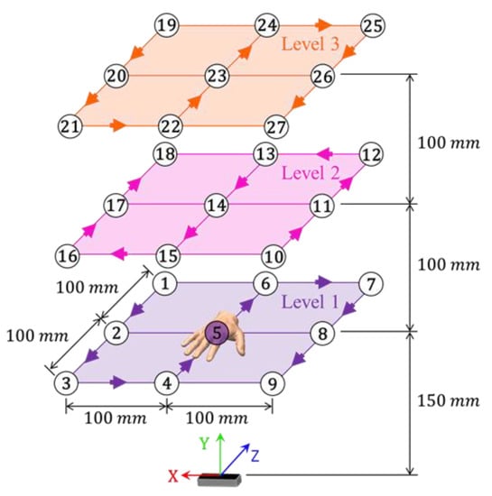 The static experiments consider twenty-seven different positions for the wooden hand, separated into three levels of height. As the experiments were performed using the two arrangements of the LMC (