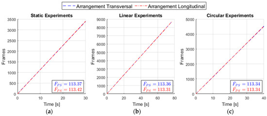 At the end of all collections, the mean acquisition rate in frames per second for each type of experiment and sensor arrangement was verified, as can be seen in