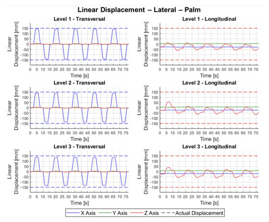 Figure 12 shown the graphs of linear displacement over time for lateral movements, with the sensor arrangements separated in two columns and the experiments organized in the three levels.