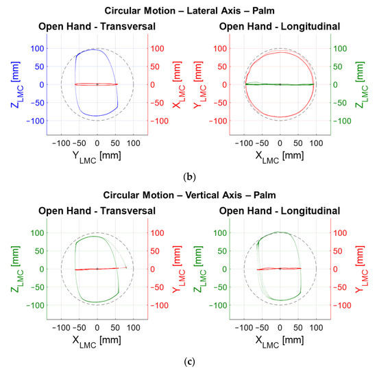 27] used a version of the LMC SDK in which tool tracking is possible. Thus, its measurements were all made using a rod as a tracked element, which facilitates its measurement for geometric reasons. The analysis made in this paper was related to the palm, whose measured point is not well defined, such as in real applications of hand rehabilitation. The average errors observed in the transversal and longitudinal arrangements static tests are greater than those presented by [