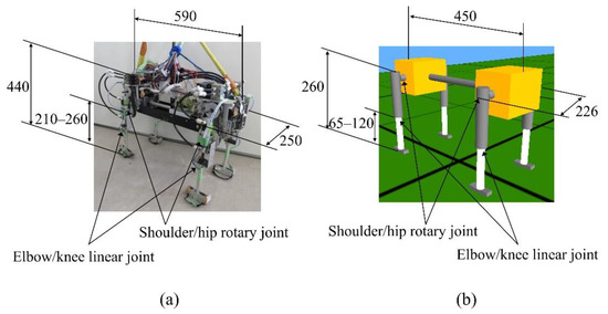 Figure 1 shows the “Spinalbot” quadruped robot and model that we developed. Spinalbot is a simple structure with a rigid torso. All legs have the same structure and two joints: a rotary joint around the pitch axis (shoulder/hip) and a linear joint (elbow/knee). The model weighs 7.8 kg, the body weighs 7.0 kg, and each leg weighs 0.2 kg. The robot weighs 11.8 kg, the body weighs 9.7 kg, and each leg weighs 0.51 kg. The rotation joints are driven by DC motors (150 W, RE40, Maxon Co., Sachseln, Switzerland) with a reduction ratio of 19.3:1. The linear joints are driven by pneumatic actuators (CG3BN25-50, SMC Co., Tokyo, Japan) and used as a variable elastic mechanism. The amount of air supplied from the air compressor (0.4 MPa at walking, 0.6 MPa at running) in the cylinder of the pneumatic actuator is modified by the solenoid valve (VZ212-5MZ-M5, SMC Co., Tokyo, Japan), therefore the air pressure in the cylinder is adjusted to be low at low speeds and high at high speeds. Each leg is designed based on a spring-loaded inverted pendulum (SLIP) model [40]. The SLIP model is a simple model of the body of an animal during locomotion.