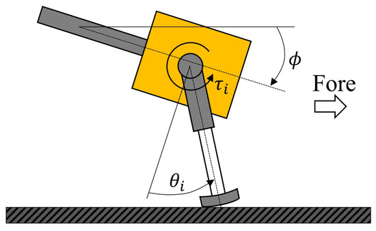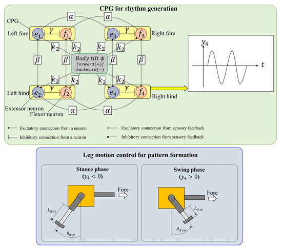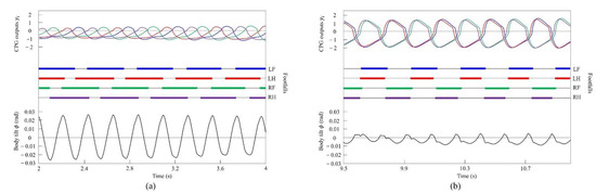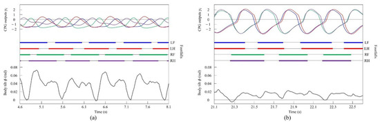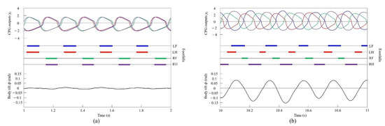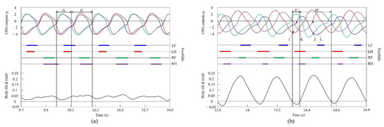 In general, although it is known that the change in the walking and running cycles is caused by the adjustment of the driving input to the CPGs ( in Equations (1) and (4)), in this paper, was modified to adjust the leg oscillation cycle because the influence of in Equations (1) and (4) on the cycle is larger than that of in the CPG model of Matsuoka [41].