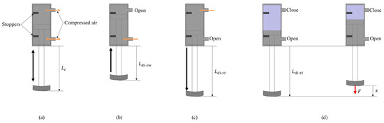 Diagram of the linear join: (a) a general diagram, (b) a state in the swing phase, (c) a state in the stance phase, and (d) a setting to measure the stiffness for Figure 5.