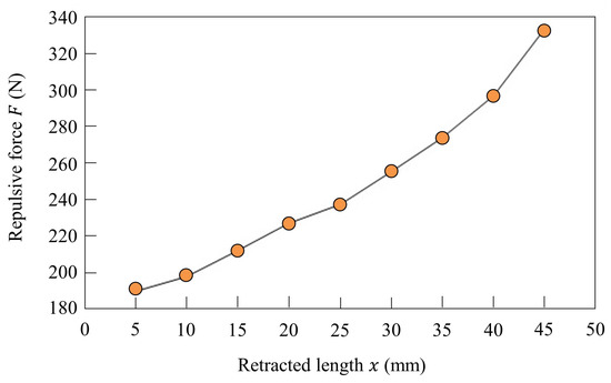 The length and stiffness of the linear joint of the robot are modified by controlling inflow and discharge of air using a solenoid valve. Figure 4a shows the structure of the pneumatic actuator. There are two inflow/outflow ports on the top and on the bottom, and the pneumatic actuator is driven by putting compressed air in the chambers. As shown in Figure 4b, the chamber at the top of the cylinder is opened and the compressed air is put in the chamber at the bottom of the cylinder, and the leg is retracted to mm in the swing phase. As shown in Figure 4c, the compressed air is put in the chamber at the top of the cylinder for T seconds and the chamber at the bottom of the cylinder is opened. Despite the value of T, the leg is extended to mm. After T seconds, the chamber at the top of the cylinder is closed, as shown in Figure 4d, and the air quantity in the cylinder is kept constant. Therefore, the leg in the stance phase functions as an air spring. The elastic force of this air spring is modified by the value of T. To change the stiffness of each leg, the elastic force is modified by increasing T according to the speed. Figure 5 shows the elastic forces of the leg when T = 54 ms, which was used when Spinalbot galloped at a speed of 1.2 m/s. Figure 4c shows this experimental state. Figure 5 indicates that sufficient elastic force can be obtained for running.