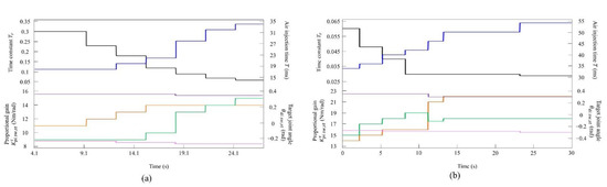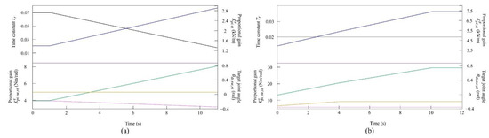 The values of each control parameter, as shown in Table 1, were the same in all legs and were unchanged during the experiment. The CPG network parameters were experimentally determined. Although it is possible to use an optimization algorithm [45], the CPG parameters had high robustness, as shown in Section 4.4, and it was possible to easily determine the parameters that achieved gait transition even by manual tuning. The values of and were set to generate a pace. The propulsive force was modified by changing the values of the parameters—the parameter for determining the leg cycle, ; the desired angle of the rotary joint, ; the proportional gain of the rotary joint, ; the parameter for determining the stiffness, ( in the simulation)—other than those parameters shown in Table 1, and the speed was changed. In this paper, these parameters were called “speed parameters”. As the speed parameters were also the same in all legs, in the experiment without vestibular modulation (Equation (10)), the phase differences between the four legs were not modified by changing the values of the speed parameters. The procedures for changing the values of the speed parameters in the simulation and in the experiment with Spinalbot are shown in Figure 6 and Figure 7, respectively. The speed parameters were modified for each of the low- to medium-speed experiments ((a) of Figure 6 and Figure 7) and the medium- to high-speed experiments ((b) of Figure 6 and Figure 7). The speed parameter contributes not only to speed change but also to posture stability. There were differences in mechanical features (e.g., size, weight, and viscous friction) between the simulation model and the robot. The sizes could not be matched due to mechanical constraints caused by the size of the devices and actuators. Moreover, in the simulation, it was difficult to model the viscous friction of the rotary joint and the pneumatic characteristics of the linear joint of the robot. For these reasons, the mechanical parameters differed between the simulation model and the robot. Therefore, there was a difference in the speed parameter. Furthermore, because it was modified according to the speed parameter, there was a difference in the CPG parameter. The reason each parameter changes stepwise is that the speed can be increased almost smoothly, even when changing the parameters step by step at an arbitrary time. The values of each parameter were experimentally determined so that stable walking and running were possible in each speed range.