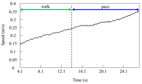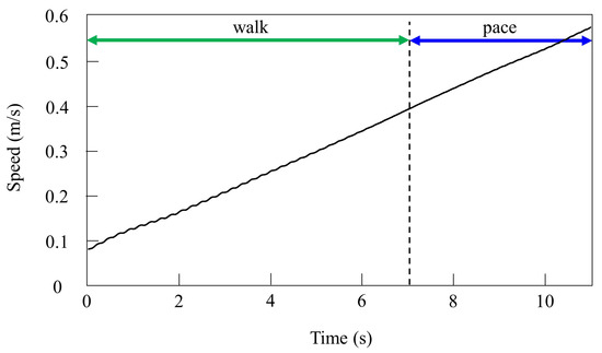 By changing the speed parameters as shown in Figure 7a, we allowed Spinalbot to locomote at low to medium speeds. It was possible to increase the speed even when using values other than those shown in Figure 7a. Regardless of the value of each parameter, the speed parameters were the same for the four legs, and the connection strength between CPGs (, ) was set so that no gait other than pace appeared when vestibular modulation was not applied () at all speeds. For this reason, it was confirmed through experimentation that the change in the speed parameter does not affect the gait transition without vestibular modulation.