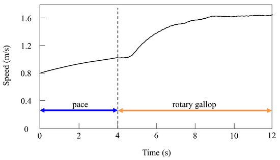 Quadruped mammals choose a gait according to their speed [1]. Most quadruped mammals choose a walk at low speeds, while at medium and high speeds the chosen gait varies depending on species. A chosen gait may be a trot or pace at medium speeds and a transverse gallop or rotary gallop at high speeds. Specifically, cats change their gait from walk to trot to transverse gallop according to speed [1], whereas greyhounds change their gait from walk to pace to rotary gallop according to speed [2,3]. Furthermore, the locomotion of quadruped robots and quadruped simulation models has been achieved by using mammals’ gaits as a basis [4,5,6,7,8,9,10,11,12,13,14,15,16,17,18,19].
