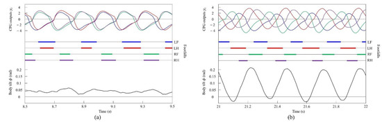 Simulated results for walking and pacing at low and medium speeds, respectively: (a) a walk at 0.2 m/s and (b) a pace at 0.5 m/s. LF, LH, RF, and RH represent left foreleg, left hind leg, right foreleg, and right hind leg, respectively. CPG outputs are colored as follows: LF: blue; LH: red; RF: green; and RH: purple. The footfalls are indicated by thick line segments. The black wavy line represents body tilt (positive when facing down).